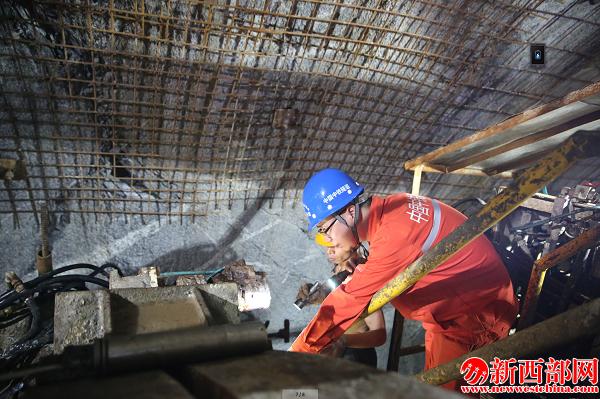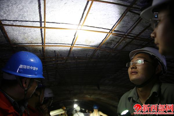 由于引漢濟渭秦嶺輸水隧洞嶺南TBM標段的巖石基本為花崗巖,巖石硬度大,所以其掘進速度十分緩慢。圖為監(jiān)理人員查看隧洞圍巖情況。