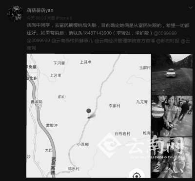 微博和微信朋友圈開(kāi)始轉(zhuǎn)發(fā)這條消息:“我高中同學(xué),去富民摘櫻桃失聯(lián),目前確定她倆是從富民失蹤的,希望一切都還好。如果有消息,請(qǐng)聯(lián)系1848714xxxx。” 文字信息下配有失聯(lián)女孩的照片。照片上,失聯(lián)女孩兒身材清瘦,五官秀氣。
