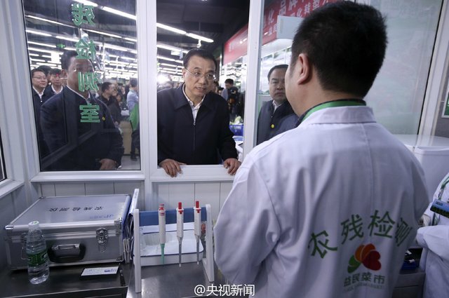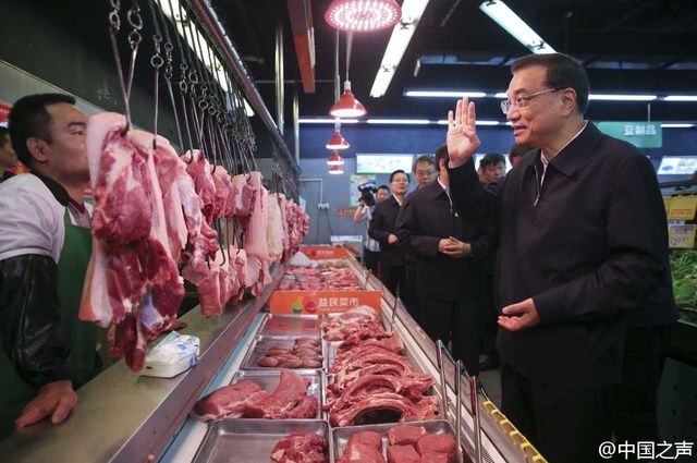 總理沿攤位不時停下細(xì)問店員各類蔬菜和豬肉價格變化,隨后對當(dāng)?shù)刎?fù)責(zé)人提出三點要求:一要保障農(nóng)產(chǎn)品供應(yīng)充足,二要保障食品安全,三要保障低保及低保邊緣困難群眾基本生活。