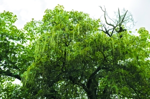 相傳在土司修建土司衙門時(shí),種植了這兩棵樹。一棵是榆樹,如今主干上已分成并排的五棵,粗壯濃密;另一棵是在臨洮當(dāng)?shù)貨]有的樹種紫荊,僅此一棵。已經(jīng)過了花期,樹枝上垂?jié)M了細(xì)細(xì)長長的豆莢,好似綠色的珠簾一樣,將整棵樹擋在了簾后。