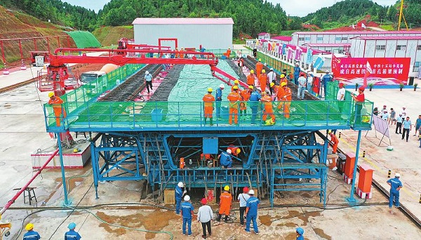 7月12日,在資陽市成自高鐵雁江制梁場,工人們正在進(jìn)行箱梁的澆筑工作。記者何海洋攝