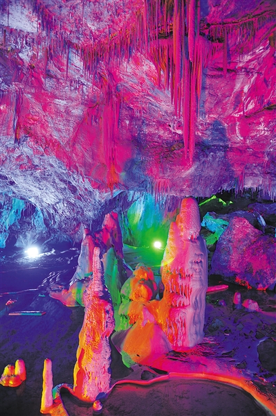 巨大的石筍、石柱巍然聳立,站在“大廳”中央天然形成的小石橋看,橋下一片相當(dāng)大面積的邊池。走近邊池,走上小石橋,站在橋上看風(fēng)景。依托這些形態(tài)各異的鐘乳石,打著不同明暗色彩的燈光,給這些本就讓人目瞪口呆的景致更加增添了夢(mèng)幻色彩。