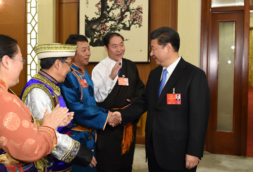 10日上午,習(xí)近平來到青海代表團(tuán)參加審議。當(dāng)總書記走進(jìn)會(huì)場(chǎng)時(shí),藏族、蒙古族、土族3位代表分別向總書記獻(xiàn)上潔白的哈達(dá),表達(dá)對(duì)黨中央和總書記的敬意。習(xí)近平請(qǐng)他們轉(zhuǎn)達(dá)對(duì)各族人民的祝福。審議中,幾位少數(shù)民族代表就民族團(tuán)結(jié)進(jìn)步、促進(jìn)城鄉(xiāng)教育公平、實(shí)施精準(zhǔn)扶貧等發(fā)言。習(xí)近平不時(shí)詢問具體情況,強(qiáng)調(diào)多民族是我國(guó)一大特色,是我國(guó)發(fā)展的一大有利因素。要著力增強(qiáng)民族地區(qū)自我發(fā)展能力和可持續(xù)發(fā)展能力,尊重民族差異、包容文化多樣,讓各民族在中華民族大家庭中手足相親、守望相助、團(tuán)結(jié)和睦、共同發(fā)展。(人民日?qǐng)?bào)全媒體平臺(tái)記者倪光輝)