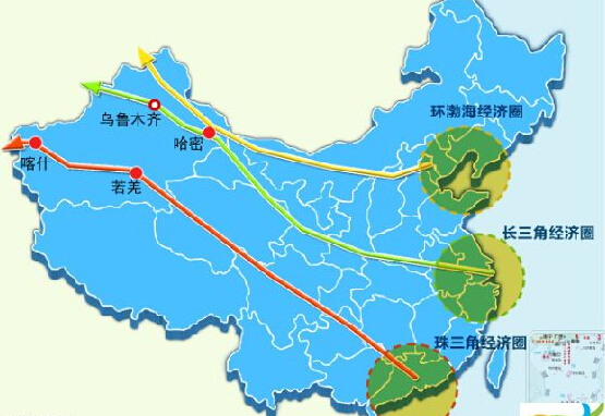????北通道起于“環(huán)渤海經(jīng)濟圈”,自京津唐經(jīng)山西、內(nèi)蒙古,從明水(甘新界)進入新疆,再經(jīng)伊吾、北屯、吉木乃西出哈薩克斯坦至俄羅斯;中通道起于“長三角經(jīng)濟圈”,自上海沿第二座亞歐大陸橋橫穿我國中原、西北諸省區(qū),由星星峽進入新疆,再經(jīng)哈密、吐魯番、烏魯木齊、精河,分別從阿拉山口和霍爾果斯出境直通中亞至歐洲;南通道起于“珠三角經(jīng)濟圈”,自廣東經(jīng)湖南、重慶、四川、青海,由依吞布拉克進入新疆,再經(jīng)若羌、和田、喀什,南下至印度洋沿岸的瓜達爾港,這是一條極具戰(zhàn)略意義的新通道。