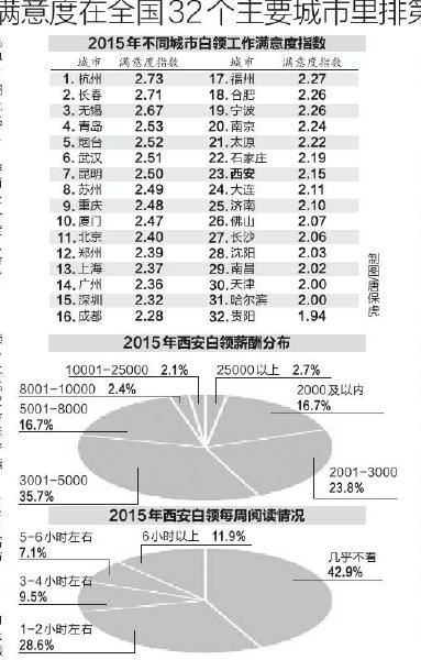 調(diào)查還顯示,2015年西安白領(lǐng)生活滿意度指數(shù)為2.38,高于全國平均水平,在全國32個主要城市中排名第7位。
