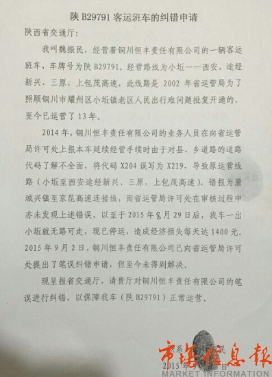 家住銅川市耀州區(qū)小丘村的魏振民師傅,從2012年7月份開始,一直經營著小丘至西安的線路,途徑新興和三原,線路正常運營了十三年之久,基本有效的解決了山區(qū)老區(qū)群眾出行難的問題。2014年陜西省交通運輸管理局要求他所在的銅川恒豐客運公司將地名變更為路標,并上報所有車輛的延續(xù)經營手續(xù)。由于銅川恒豐公司對線路情況不太了解,出現了一個小的筆誤,將他的車輛代碼x204誤寫為x219,上報給省運管局,省運管局許可處在審核的時候也未發(fā)現誤寫的信息,結果在今年8月份底三原客運股在例行檢查的時候發(fā)現了他的車輛路碼代號不對,就讓他停運了。在此之前,他掛靠的銅川恒豐公司于2015年9月13日向陜西省交通廳運輸管理局申請糾錯,至今仍未解決。