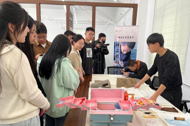 活動(dòng)過(guò)程中,學(xué)校文化藝術(shù)教育中心還邀請(qǐng)民間非遺傳承藝人現(xiàn)場(chǎng)向活動(dòng)嘉賓進(jìn)行了古籍修復(fù)、碑石鐫刻、磚石拓印、篆刻技藝展示。
