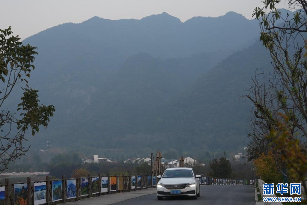 ▲11月13日,在西安市鄠邑區(qū)蔡家坡村,一輛轎車駛過柵欄上有攝影展的鄉(xiāng)村公路。新華網(wǎng) 楊喜龍 攝
