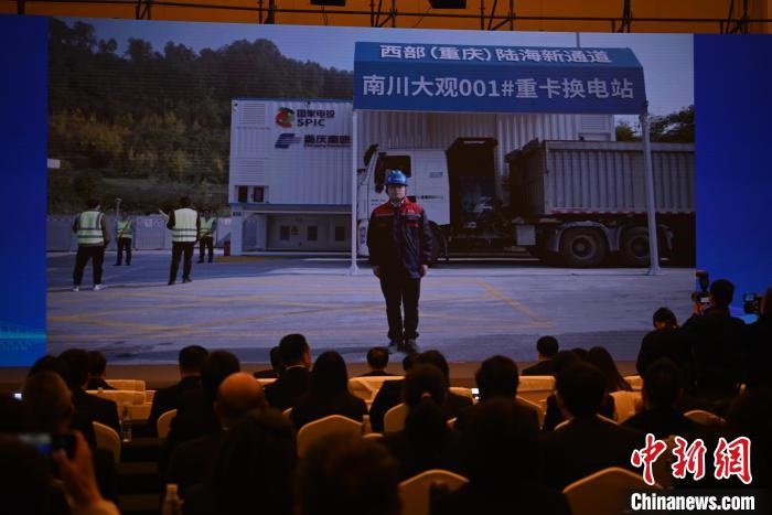 11月23日,西部陸海新通道(高速公路)電動(dòng)走廊在重慶發(fā)布,圖為電動(dòng)重卡充換電設(shè)施“1號(hào)站”正式投用,與發(fā)布現(xiàn)場(chǎng)連線。 張旭 攝