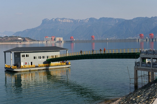 2016年2月16日,三峽壩前首座泵船式取水泵站搭建完成。這種取水泵站由船舶和萬向活絡(luò)接搖臂輸水管組成,會隨著三峽庫區(qū)水位的漲落而自由移動,解決了纜車取水移動頻繁耗時(shí)長的問題,為三峽庫區(qū)移民生產(chǎn)生活用水提供保障。
