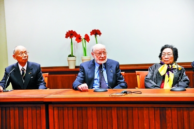 12月6日,2015年諾貝爾生理學(xué)或醫(yī)學(xué)獎(jiǎng)獲得者屠呦呦(右)、威廉·坎貝爾(中)和大村智在瑞典首都斯德哥爾摩出席2015年諾貝爾生理學(xué)或醫(yī)學(xué)獎(jiǎng)獲獎(jiǎng)?wù)咝侣劙l(fā)布會(huì)。新華社記者葉平凡攝