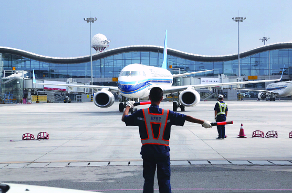 機(jī)務(wù)人員指揮一架E190支線客機(jī)進(jìn)入停機(jī)位。