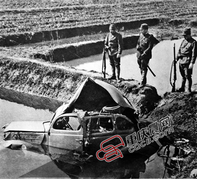 圖為日軍隨軍記者拍攝,日軍正在觀測被我軍地雷炸毀掀翻的汽車。