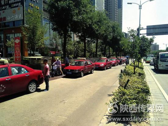 近日,記者發(fā)現(xiàn),在鳳城五路東南角地鐵D出入口路邊,十余輛懸掛“陜A7T”高陵牌照的紅色出租車在路邊排起長隊,占據(jù)了原本就不寬的公交車道,小中巴勉強(qiáng)可以通過,大型公交車根本無法正常通行。其中更有甚者,有些司機(jī)干脆把車直接停在鳳城五路十字路口處,完全不顧來往的車流,肆無忌憚地在馬路邊上拉客。而就在這里排隊等待拉客的出租車中,還夾雜著幾輛沒有任何標(biāo)識的私家車??匆娪浾咦呓摵谲囁緳C(jī)立即上前詢問:兄弟,拼座還是包車?要想快就坐我這車,不排隊,公交得一個小時,我這二十分鐘保證你到馬家灣。