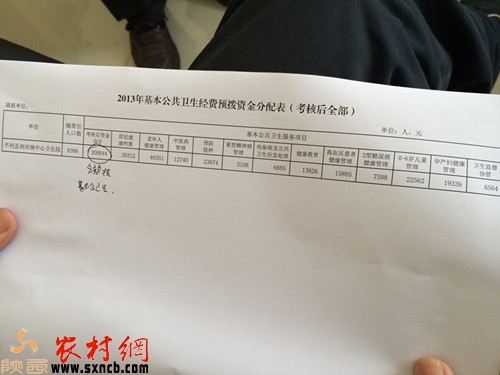 最后,財(cái)務(wù)人員只給記者提供了一份2013年基本公共衛(wèi)生經(jīng)費(fèi)預(yù)撥資金分配表(考核后全部),單位是平利縣西河鎮(zhèn)中心衛(wèi)生院,常住人口數(shù)是8386人,后面還有12項(xiàng)服務(wù)項(xiàng)目。