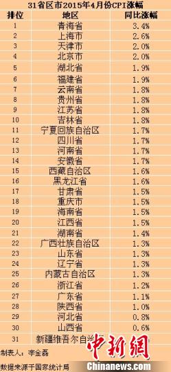 在這31個(gè)省份中,青海4月份CPI同比漲幅最高,為3.4%,也是全國僅有的CPI漲幅在“3”時(shí)代的地區(qū)。新疆漲幅最低,僅為0.2%。