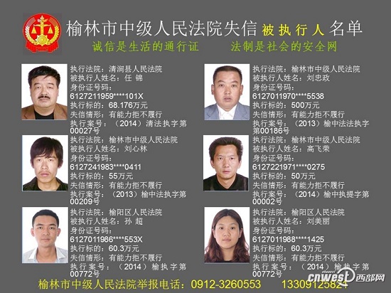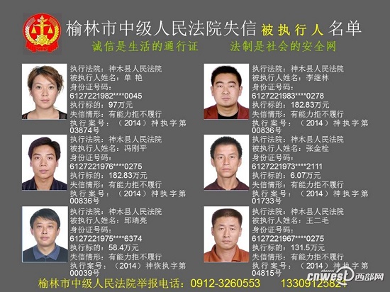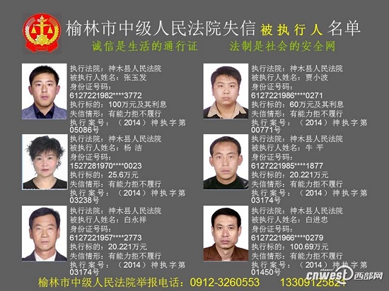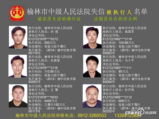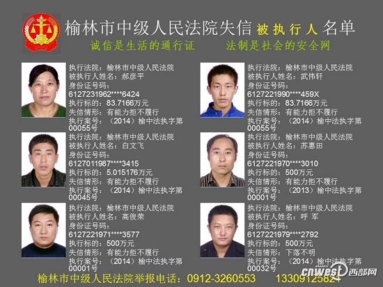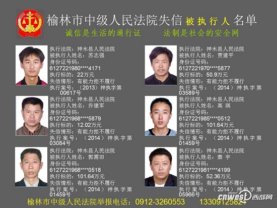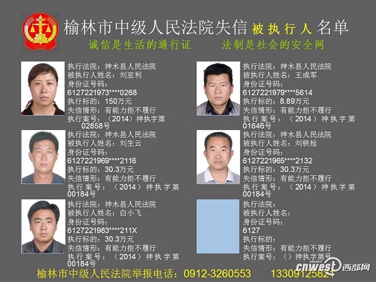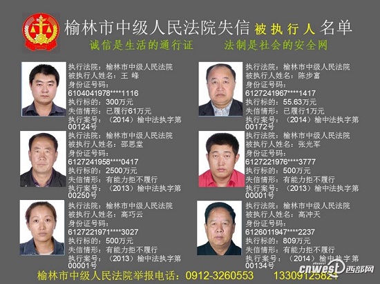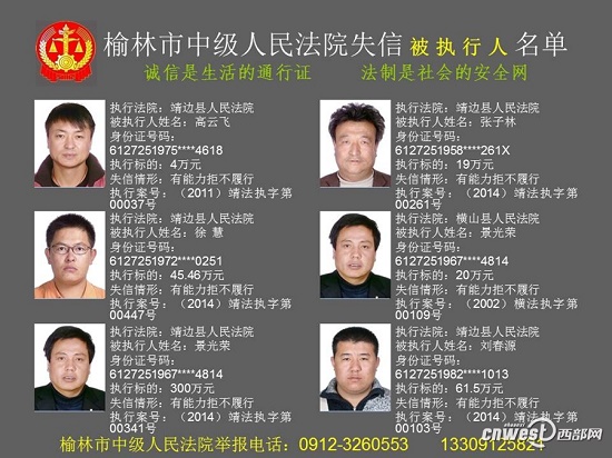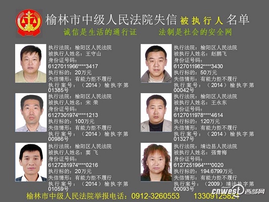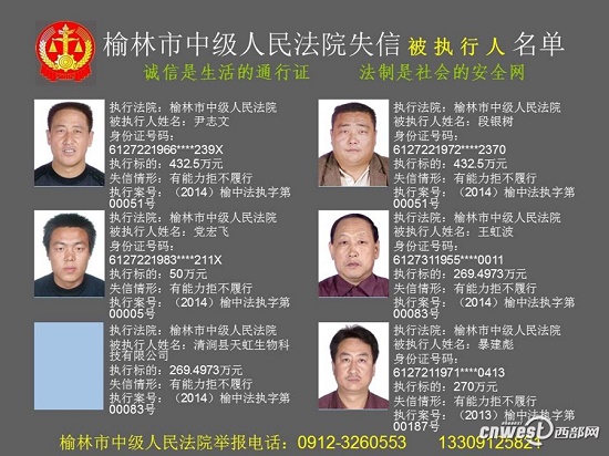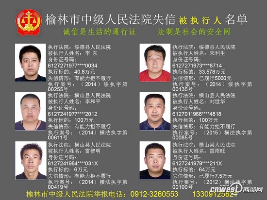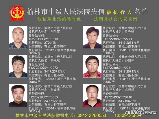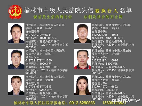 據(jù)了解,榆林為了加大對(duì)“老賴(lài)”的懲戒力度,維護(hù)當(dāng)事人的合法權(quán)益。從2014年10月以來(lái),榆林市中級(jí)人民法院先后兩次通過(guò)官方微博、微信公眾平臺(tái)和平面媒體發(fā)布了失信被執(zhí)行人信息。