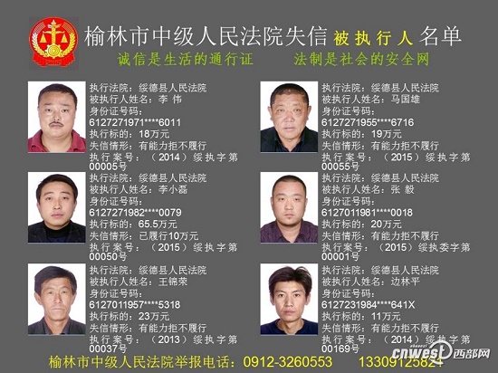 榆林今天公布了第二批96名失信被執(zhí)行人信息(詳情點(diǎn)擊http://www.ylwm.cn/zt/sxbzxmd/
