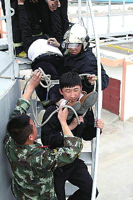 20多分鐘后,當男子正與民警交流時,兩名消防隊員悄然上到罐頂向男子靠近。6時12分,就在男子發(fā)覺救援人員,回頭的瞬間,消防戰(zhàn)士快速將男子拉回并控制,隨后民警與其他消防隊員及時上到罐頂支援。被救后的男子表現(xiàn)出極不配合的態(tài)度,不愿意配合救援人員到達地面。考慮到罐體頂部呈錐形、通道梯陡狹窄以及罐頂部、通道鐵梯的重力承受力等諸多潛在的危險因素,救援人員商議后決定,用繩子對男子腿腳進行約束,再用擔架將男子抬到地面,然而因為罐體上的鐵梯狹窄陡立盤旋而下,擔架沒辦法用。最后決定由民警和消防戰(zhàn)士合力將男子從鐵梯一步一個臺階慢慢地往下抬。