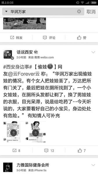 近日,網(wǎng)友“話說西安”的微博轉(zhuǎn)發(fā)一位網(wǎng)友提供的消息稱:“華潤萬家出現(xiàn)偷娃娃的情況,有個女人把娃丟了,萬達把所有門關了,最后把娃在廁所找到了,一個小女娃娃,在廁所頭發(fā)都讓剃光了,換了男娃娃的衣服,目光呆滯,說是給吃了藥。”一些網(wǎng)友跟帖評論說,大家把娃看好了,身邊處處有危險,提醒大家看好孩子。以訛傳訛,搞得人心惶惶。14日晚,“西安公安”官方微博發(fā)出了辟謠信息稱:“近日在個別微博、微信中傳播的‘華潤萬家有人偷娃’的相關信息系早前網(wǎng)絡流傳的謠言,多地警方先前早已辟謠。西安警方亦再次核查了相關報警資料,均未發(fā)現(xiàn)類似案件報警信息。警方提示廣大網(wǎng)民切勿信謠、傳謠,并將依法追究制造、傳播網(wǎng)絡謠言者的法律責任!”