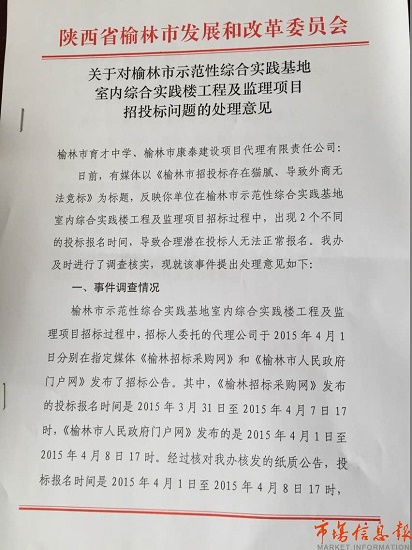 針對(duì)市場(chǎng)信息報(bào)日前報(bào)道的《榆林市招投標(biāo)存在貓膩導(dǎo)致外商無(wú)法競(jìng)標(biāo)》一文,榆林市發(fā)改委招標(biāo)辦經(jīng)過(guò)調(diào)查后做出回復(fù)。