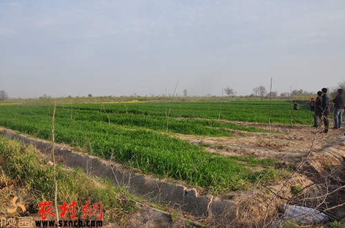 4月10日,在興隆村大坡頭附近被毀的麥田,記者見到地里新栽上了一行行整齊的核桃樹,每行樹下約有40至50公分左右寬的麥子被完全鏟除,地面裸露。麥田西鄰磚廠,一眼看起來,綠黃相間,十分刺目。