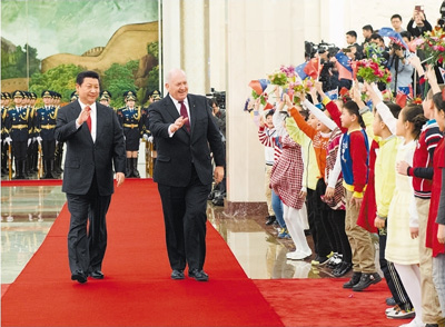 習近平指出,近幾個月來,中澳雙方積極落實兩國領導人去年達成的共識,在多個領域取得了重要進展。中澳全方位、立體化的合作格局正在形成過程中。中澳同處亞太地區(qū),深化中澳關系,利在兩國,惠及整個地區(qū)。希望雙方抓住雙邊關系重要發(fā)展機遇,順應時代潮流和兩國人民共同愿望,不斷深化對話、交流、合作,推動中澳全面戰(zhàn)略伙伴關系持續(xù)穩(wěn)定發(fā)展。