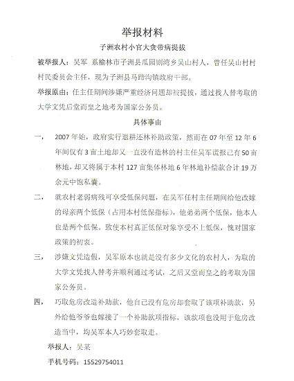 被舉報(bào)人:吳軍系榆林市子洲縣瓜園則灣鄉(xiāng)吳山村人,曾任吳山村村村民委員會主任,現(xiàn)為子洲縣馬蹄溝鎮(zhèn)政府干部。