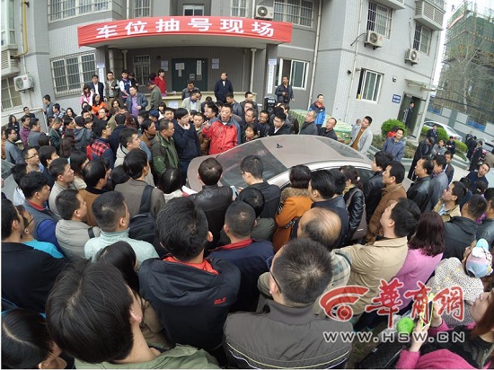 上午9時(shí)20分,華商報(bào)記者來(lái)到該小區(qū),小區(qū)院里站了很多人,院內(nèi)設(shè)了一個(gè)臨時(shí)主席臺(tái),上面拉著一個(gè)寫(xiě)著“車位抽號(hào)現(xiàn)場(chǎng)”的橫幅。