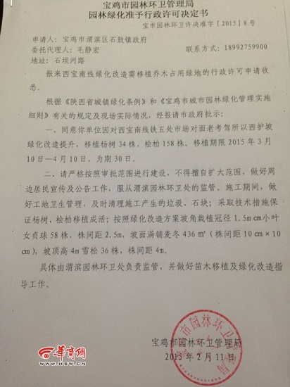 華商報(bào)記者見到了一份園林環(huán)衛(wèi)部門的文件,是寶雞市園林環(huán)衛(wèi)管理局下發(fā)的《園林綠化準(zhǔn)予行政許可決定書》,申請人為寶雞市渭濱區(qū)石鼓鎮(zhèn)政府,對西寶南線鐵五處市場對面綠化改造提升,移植楊樹34棵,采取技術(shù)措施保證楊樹移植成活。
