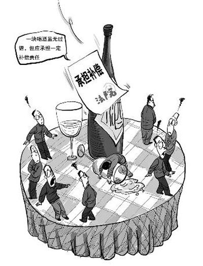 今年3月12日,法院依法判處宴請(qǐng)人王某對(duì)曹某的死亡承擔(dān)補(bǔ)償責(zé)任5000元;最后離席的何某、姚某等8人各承擔(dān)補(bǔ)償責(zé)任2500元;參與飲酒但離席較早的孫某等4人各承擔(dān)補(bǔ)償責(zé)任1500元;未飲酒且離席較早的李某承擔(dān)補(bǔ)償責(zé)任500元;駁回原告要超過補(bǔ)償數(shù)額部分的請(qǐng)求。