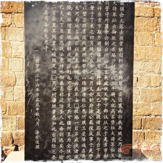 對此,徐茂成說:“原碑早已不知道蹤跡,我在2004年請當(dāng)?shù)匾晃粫遥鶕?jù)《延綏鎮(zhèn)志》的記載手寫而刻。但效果不是很好,便又在去年通過電腦排版,重新立了這座碑。”他接著說,“至于碑上的方框,那是因為《延綏鎮(zhèn)志》原文中就是用方框代替,不清楚那到底是什么字。為了尊重事實,我們也便用方框代替?!?