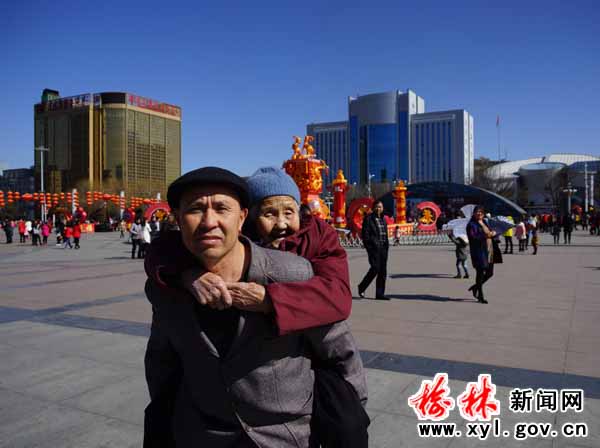 2月26日中午,神木攝影愛好者粱亮平路過人民廣場時(shí),偶見一中年男子背著一位老太太看秧歌。男子大踏步走在廣場,背上的老人很幸福地欣賞著風(fēng)景。