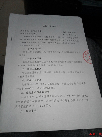 下午2:00記者來到鳳翔縣國土資源局了解情況,一位工作人員給記者出示了一份陜西省人民政府審批土地件,陜西政土批[2014]223號文件,關于鳳翔縣2014年度第二批農用地轉用土地征收的批復,批復中同意將鳳翔縣鄉(xiāng)級土地總體規(guī)劃確定的建設用地規(guī)模范圍的陳村鎮(zhèn),糜桿橋鎮(zhèn)等村34.56公頃農用地轉為建設用地,以此來搪塞記者,說是陜西晟達銅雕有限公司有土地手續(xù)。當記者提出要看的是銅雕有限公司項目用地審批許可證時,一位杜姓負責人稱:“陜西晟達銅雕有限公司目前沒有用地手續(xù),相關用地手續(xù)正在辦理當中?!痹诮o記者出示的縣征地中心與鎮(zhèn)政府簽訂的征地協(xié)議書,記者看到,該宗土地12.642畝,位于十里鋪二組。于2014年6月14日,經鳳翔縣人民政府第7次常務會議研究,每畝地連同地上的附著物及青苗補償,補償村民53000元/畝,共計670026元,一次性全部以銀行轉帳方式兌付給村民。征地協(xié)議還明確規(guī)定:此宗土地未經批準前,不得進行施工,不得改變土地原貌。當記者質疑征地協(xié)議明確要求,“要全額把征地款兌付到村民手中,為什么村民說只拿到4萬元,剩余的13000元為啥不給村民兌付?”杜姓負責人稱:“剩余的13000元未給村民兌付,主要是村民土地上的附屬物及青苗,征地村民代表等都需要費用?!碑斢浾咛岢鰶]有土地手續(xù)能否動工時,屬不屬于未批先建時,該負責人稱:“該項目是縣上的文化項目?!?
