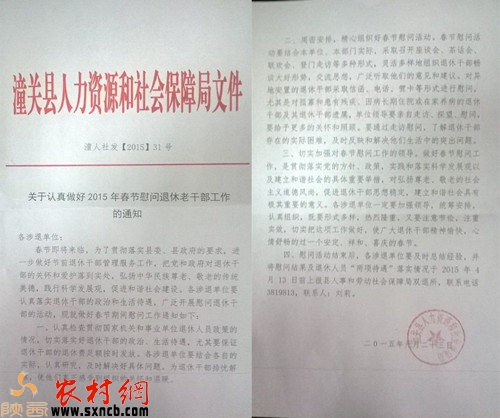 潼關縣人社局提供的潼人社發(fā)[2015]31號文件——《關于認真做好2015年春節(jié)慰問退休老干部工作的通知》,文件對慰問活動的形式做了明確的規(guī)定,文中強調“春節(jié)慰問活動要結合實際,采取召開座談會、茶話會、聯(lián)歡會、登門走訪等多種形式。”“對異地安置的退休干部采取信函、電話、賀卡等形式進行慰問”“各涉退單位要注意節(jié)儉,注重實效”等一系列具體要求,其中并沒有允許發(fā)放慰問品一項,相反的還一再強調要注意節(jié)儉。