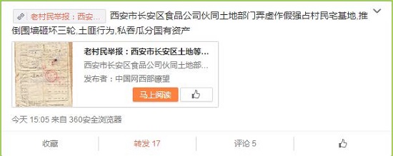 據(jù)新浪微博爆料:西安市長安區(qū)食品公司伙同土地部門弄虛作假強(qiáng)占村民宅基地,推倒圍墻砸壞三輪,土匪行為,私吞瓜分國有資產(chǎn)。