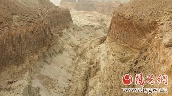 1月12日記者驅(qū)車來到了戶縣澇店鎮(zhèn)里賢村,在村民的帶領(lǐng)下來到了里賢村西磚廠,現(xiàn)場已經(jīng)被挖的滿目瘡痍。一位村民手指著一條約五、六米的深坑告訴記者,這里二米多深的土層下面就是沙子,而且沙子的價(jià)錢給黃土貴,所以現(xiàn)在被磚廠的承包人挖成了這樣,看著都讓人心疼。