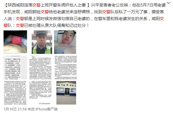 16日下午,華商報(bào)記者從網(wǎng)上搜到該微博,該條微博稱,“據(jù)興平受害者的老公反映,他是去年5月7日用老婆手機(jī)發(fā)現(xiàn),咸陽郭姓交警給他老婆發(fā)來淫穢裸照,找到交警隊(duì)后私了一萬元了事。而受害人說,交警郭某是在上班時(shí)候通過發(fā)微信勾搭其老婆的,并在警車?yán)锖推淅掀虐l(fā)生了關(guān)系,而在其向西寶高交大隊(duì)反映后,還受到郭某的短信威脅?!蔽⒉┻€附有三張男子照片和一張男子露下體的圖片。