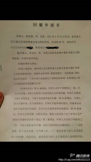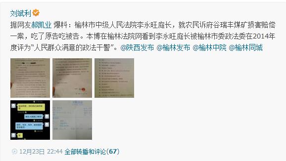 據(jù)騰訊微博爆料:網(wǎng)友郝凱業(yè)爆料:榆林市中級(jí)人民法院李永旺庭長(zhǎng),就農(nóng)民訴府谷瑞豐煤礦損害賠償一案,吃了原告吃被告。本博在榆林法院網(wǎng)看到李永旺庭長(zhǎng)被榆林市委政法委在2014年度評(píng)為“人民群眾滿意的政法干警”。