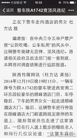 【警車陜A1742竟頂風(fēng)違紀(jì)】2014年12月19日晚19時(shí)15分,一輛車牌號(hào)為陜A1742的警車駛進(jìn)西安南二環(huán)東段較豪華的順?lè)寰频觊T前,車停穩(wěn)后,下車的男男女女一起走進(jìn)順?lè)寰频甏箝T。隨后,這輛警車逆行停放在順?lè)寰频甏箝T前道路規(guī)定禁停的車道上,隨后駕駛員也走進(jìn)了這家酒店。