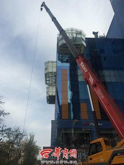 12月3日上午,在西安市小寨路與長安路十字東北角的賽格商廈,遠遠就能看到有塔吊在賽格樓外施工,工人們正在作業(yè)。在小寨東路一邊,8個玻璃陽臺正在施工,長安路一面有3個,共11個。目測,玻璃陽臺向外約伸出2米,約一層樓高。