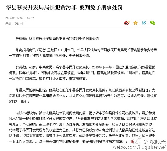 據新浪微博爆料:49歲的薛英勛是華縣移民局局長,去年12月曾因涉嫌貪污被立案后又被取保、監(jiān)視居住。今年7月華縣法院在開庭審理其貪污案時,薛英勛卻在“監(jiān)視居住”的情況下,威脅、毆打證人,被輿論關注且引發(fā)全國主流媒體熱議后才逮捕。然而,薛英勛貪污案在時隔四個月后的11月25日,華縣檢察院建議判5年以上,而華縣法院認為薛英勛雖有罪,卻判免于刑事處罰。此判決一經公開,立即召來眾多網民質疑與圍觀。陜西知名記者崔永利說:“這就意味著華縣黨委和政府還要再用好公仆”。