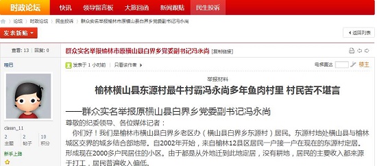 2005年村里搬來了一戶居民,戶主叫馮永尚,原橫山縣白界鄉(xiāng)黨委副書記、黨員。這就是我們下述舉報(bào)材料中的被舉報(bào)人。