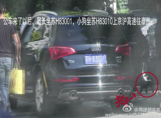 記者了解到,高建超今年40歲,1996年參加工作,直到2011年4月都在淮安市清浦公安分局分局工作,隨后調(diào)入淮安市公安局。公開資料顯示,被舉報人曹興龍現(xiàn)任清浦區(qū)區(qū)委常委、公安分局局長,今年51歲,2010年6月由淮安市公安局調(diào)任青浦區(qū)公安分局擔任局長。圖中文字為:節(jié)日期間,小狗乘坐蘇H83001回到家。