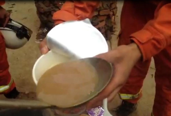 另據(jù)中央人民廣播電臺中國之聲記者@王小米粒兒微博稱,第一天就趕到災區(qū)的央廣李騰飛:是真的,親眼看到親耳聽到,第一天群眾缺水部隊缺水,混水是這里的自來水,部隊里要求只吃面不喝湯,我和同事都吃了,也有人是用礦泉水冷的拌了一下吃。什么都運不進來更何況補給了。真的在排隊,每次水燒開很快就被打光了。