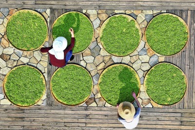 ▲在湖南衡東縣白蓮鎮(zhèn),當(dāng)?shù)卮迕裨谛〕醪鑸?chǎng)攤曬春茶。新華社發(fā)