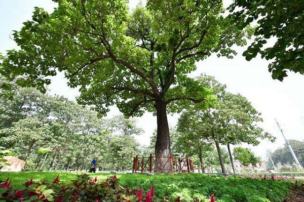 游客從蘭考焦裕祿干部學(xué)院門口的“焦桐”下走過(2017年8月9日攝)。這棵泡桐是焦裕祿當(dāng)年親手種下,被人們稱為“焦桐”。
