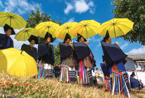 身著節(jié)日盛裝的彝族姑娘撐著朵洛荷款款走來(lái)