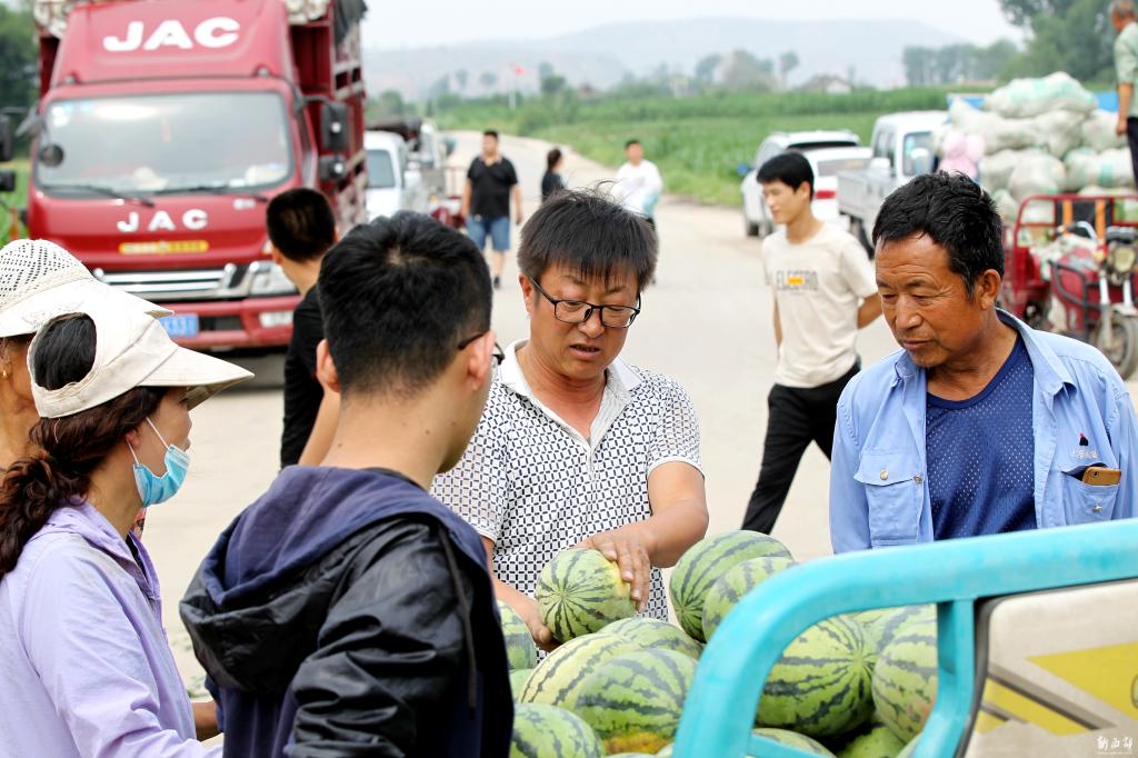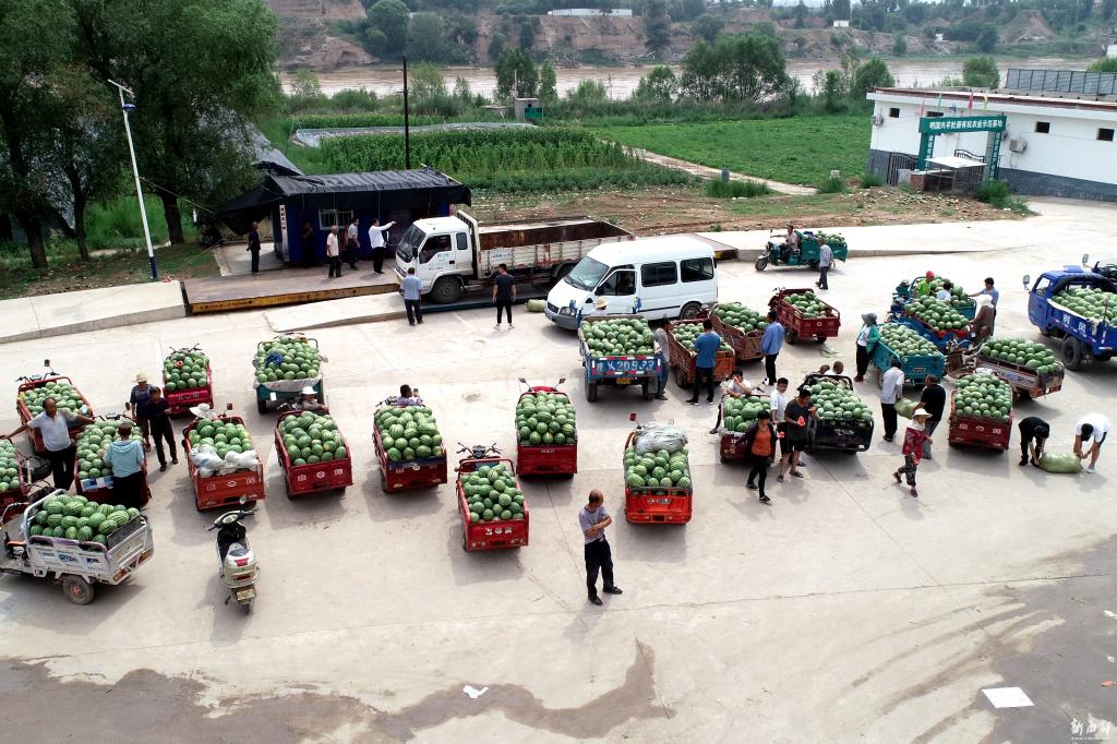 筆者走訪看到,無論是在沿黃觀光路兩旁,還是瓜菜交易市場,前來購瓜的游客和客商絡(luò)繹不絕。堯峁村瓜菜交易市場是當(dāng)?shù)剌^有影響力的瓜菜批發(fā)市場,近幾日,市場內(nèi)車水馬龍,熱鬧非凡。據(jù)了解,僅這個交易市場一天就有5-6萬斤西瓜的銷售量,客商來自山西臨縣、保德,內(nèi)蒙古準(zhǔn)格爾旗、呼和浩特以及府谷、神木等地?!拔疫B續(xù)多年來到墻頭販賣西瓜,今年已經(jīng)七八次了,這里的西瓜口感好,口碑更好”??蜕掏趵f。