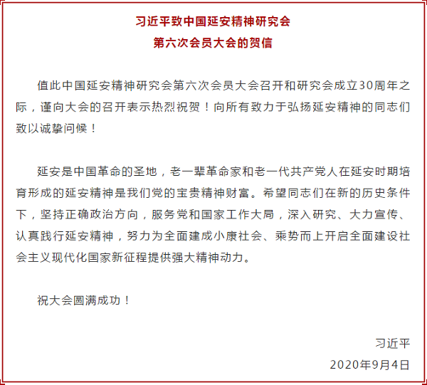 中國(guó)延安精神研究會(huì)第六次會(huì)員大會(huì)9月19日在京召開,中共中央總書記、國(guó)家主席、中央軍委主席習(xí)近平發(fā)來(lái)賀信,向大會(huì)的召開和研究會(huì)成立30周年表示熱烈祝賀,向所有致力于弘揚(yáng)延安精神的同志們致以誠(chéng)摯問(wèn)候。